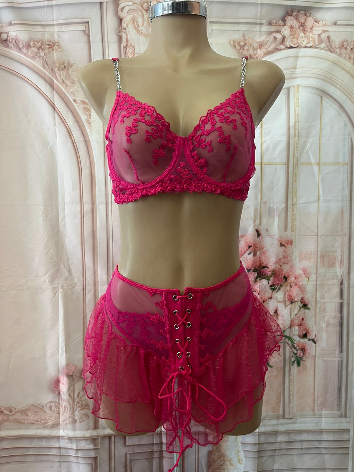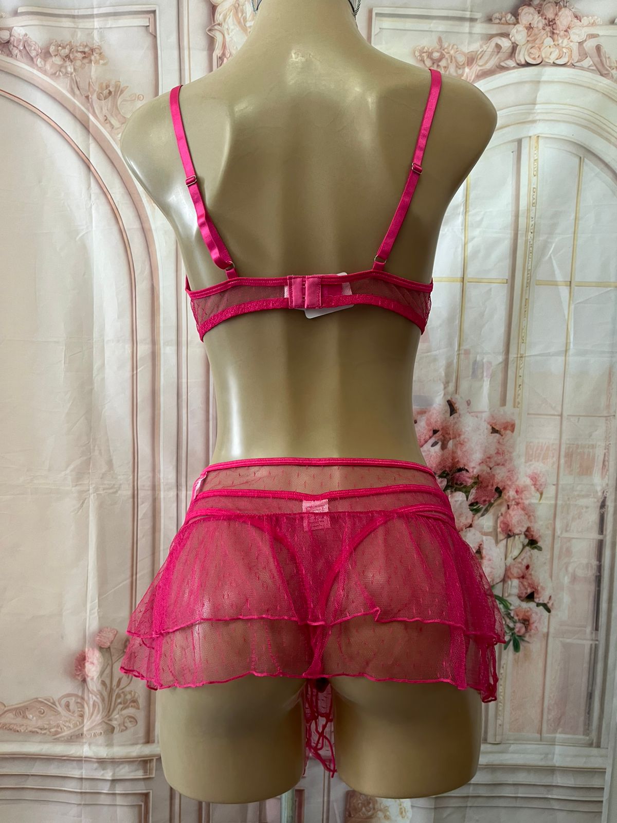 La braguita a juego tiene un diseño tipo faldita con transparencias y un coqueto detalle de cordones en la parte delantera, que añade un toque romántico y seductor al conjunto. Perfecto para sorprender y realzar tu belleza natural.