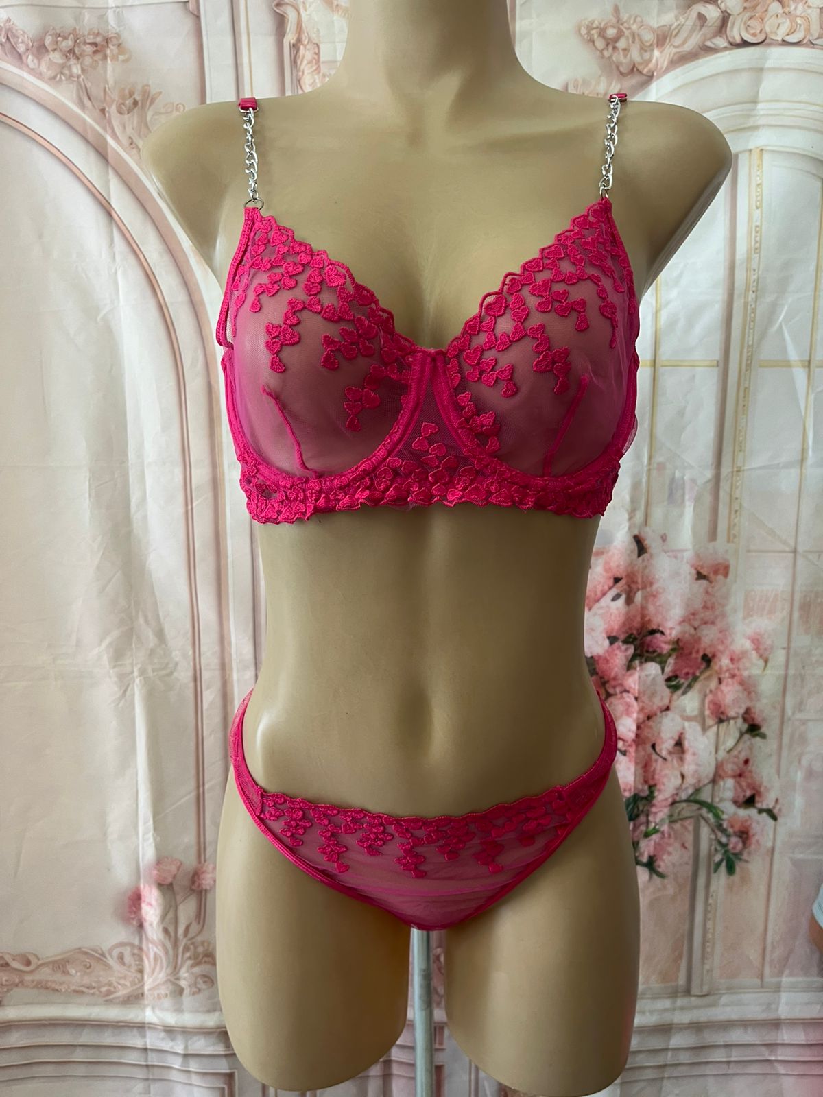 Descubre la sensualidad y el encanto de este conjunto de lencería rosa, ideal para ocasiones especiales o para sentirte increíble todos los días. El sujetador de encaje transparente, adornado con delicados bordados florales, realza el busto con un toque femenino y atractivo. Los tirantes finos le aportan un aire elegante y sofisticado.